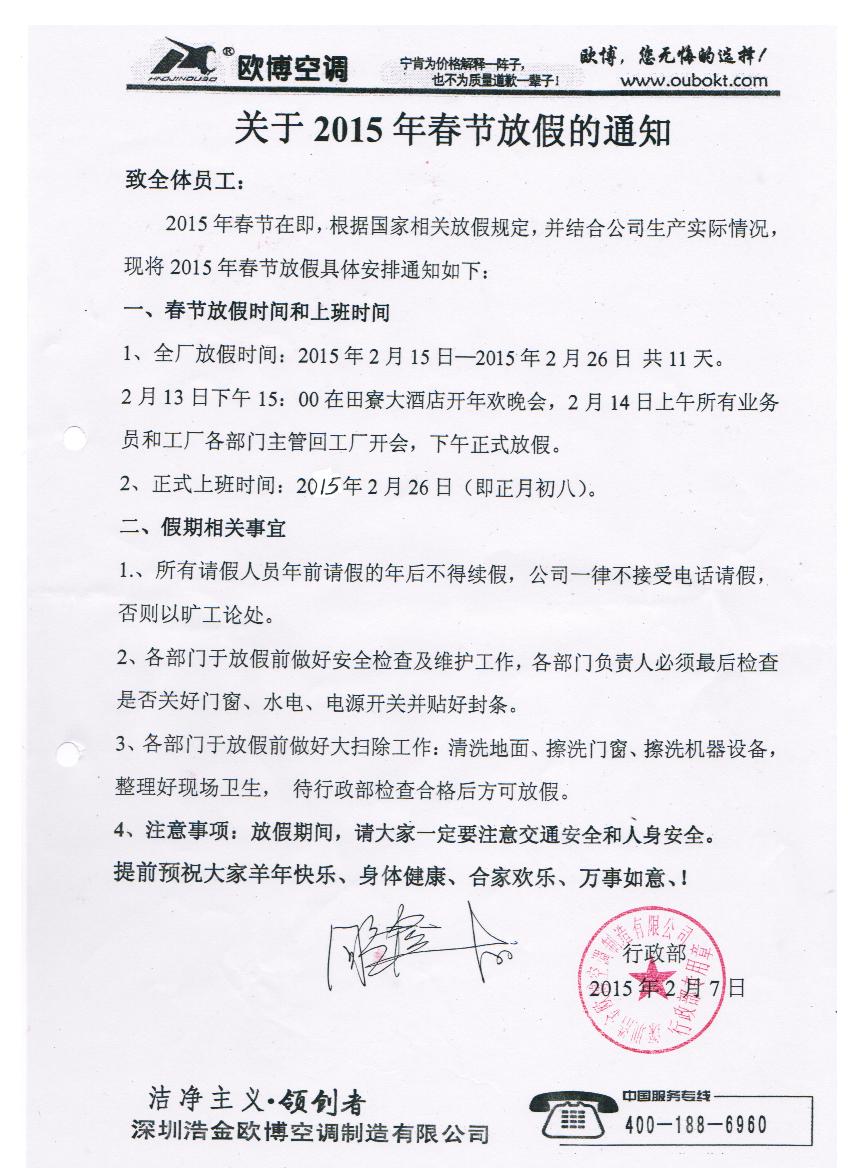 歐博空調(diào)2015年春節(jié)放假安排通知